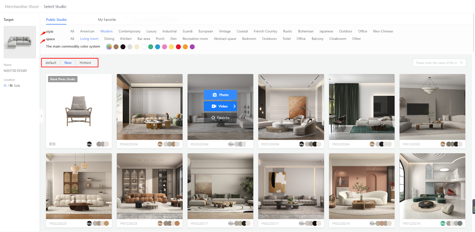 1. You can filter studios from Public Studio based on style and space. You can also filter them by tags such as default, New and Hottest. The camera icon that appears means the studio comes with the video shooting feature.